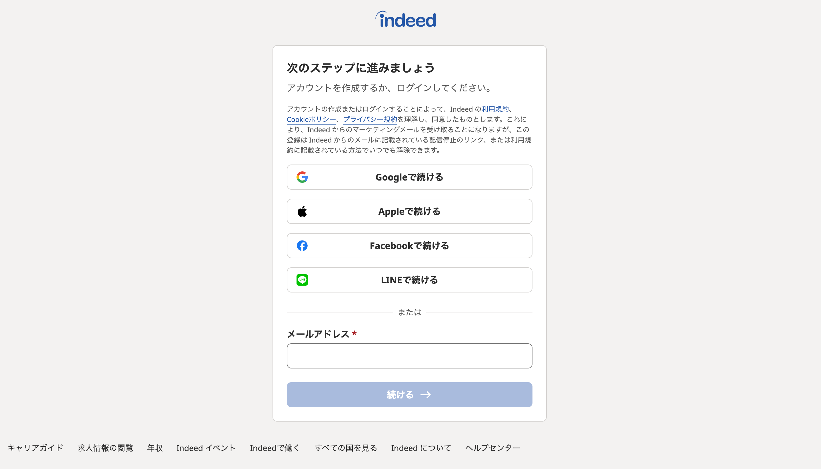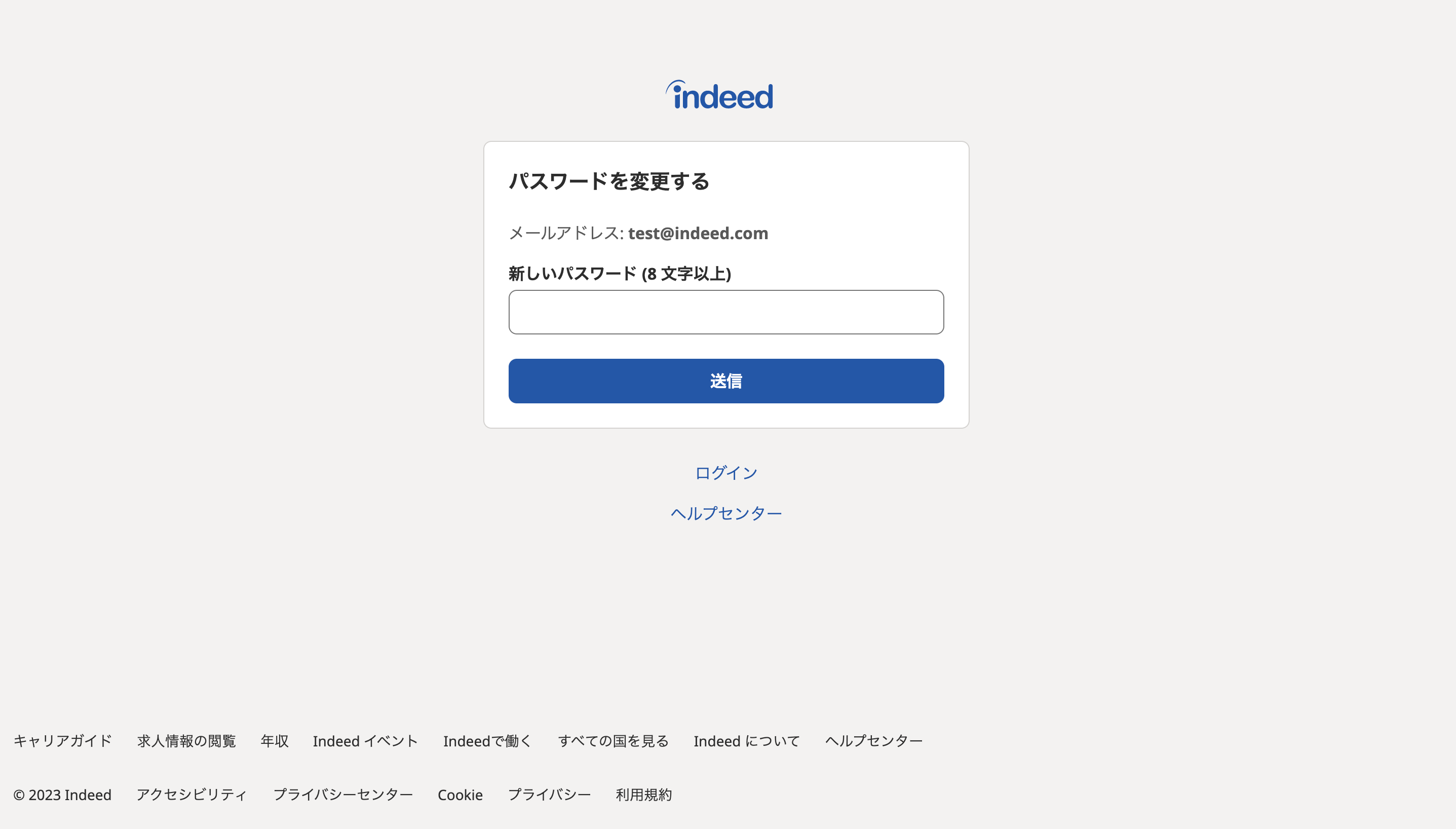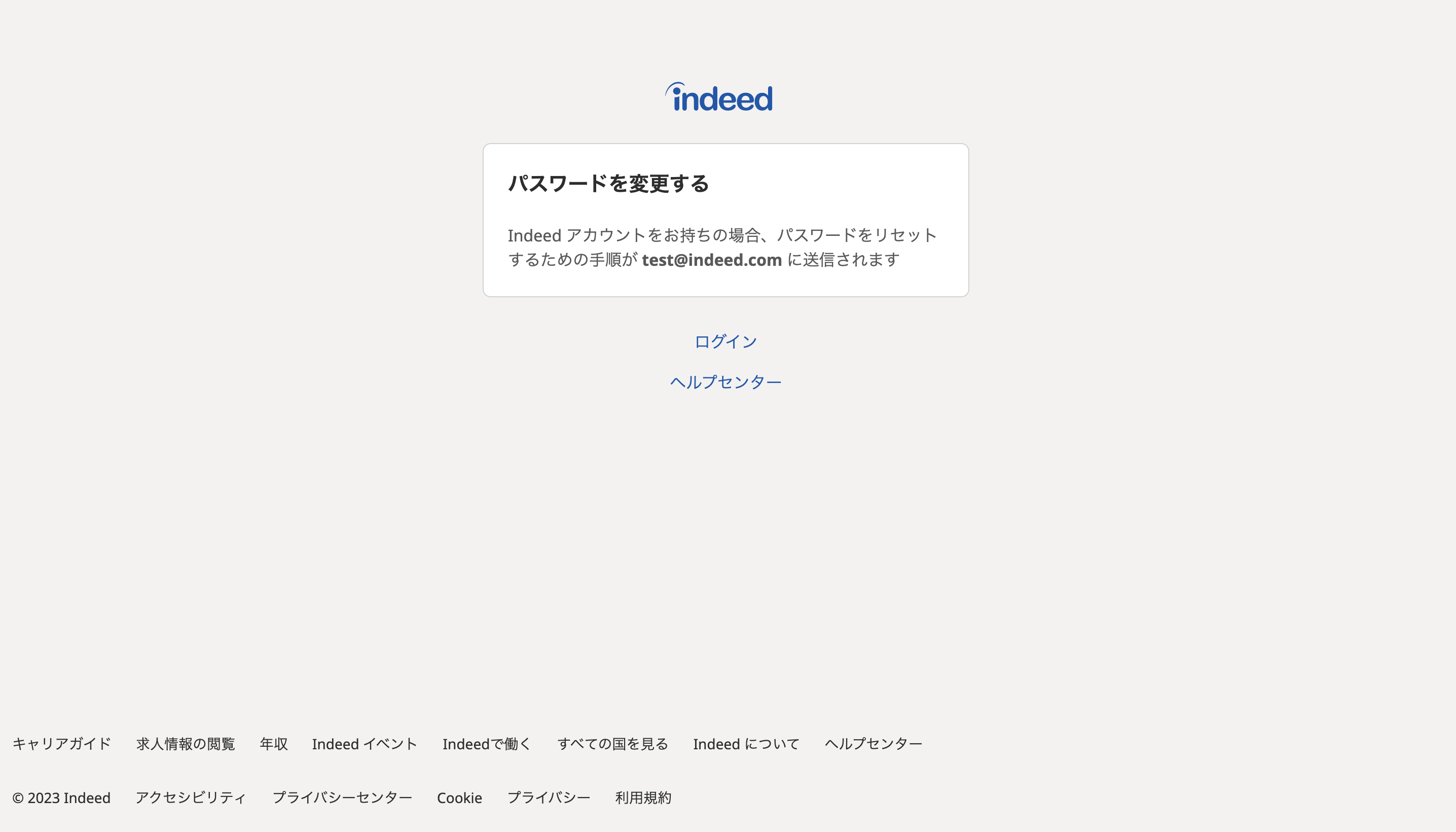前の画面で入力したメールアドレスでIndeed アカウントが存在する場合、パスワードをリセットするための手順がそのメールアドレス宛に送信されます。