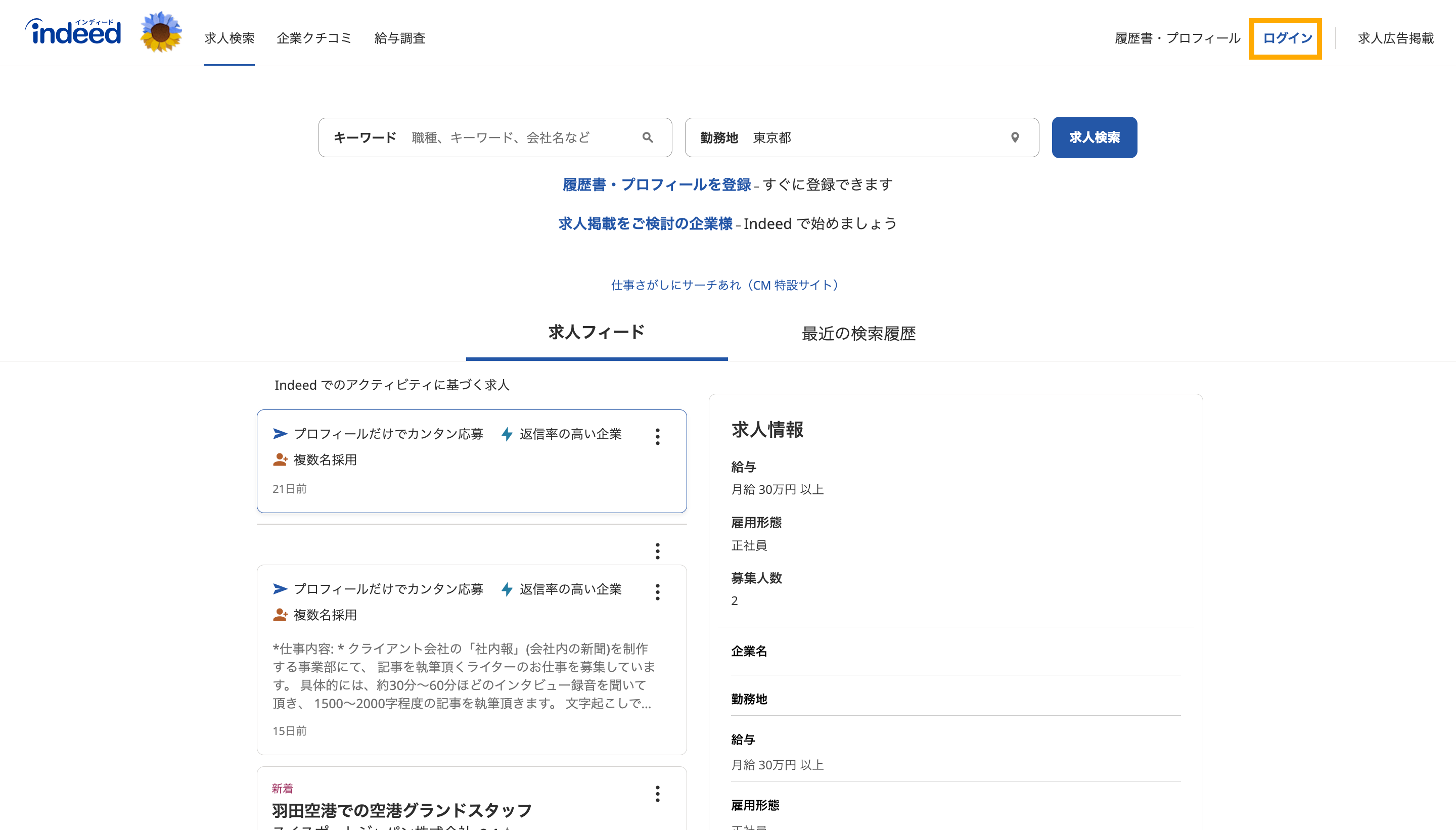 続いて、「求人広告掲載ページ」の右上にある 「ログイン」 をクリックしてください。