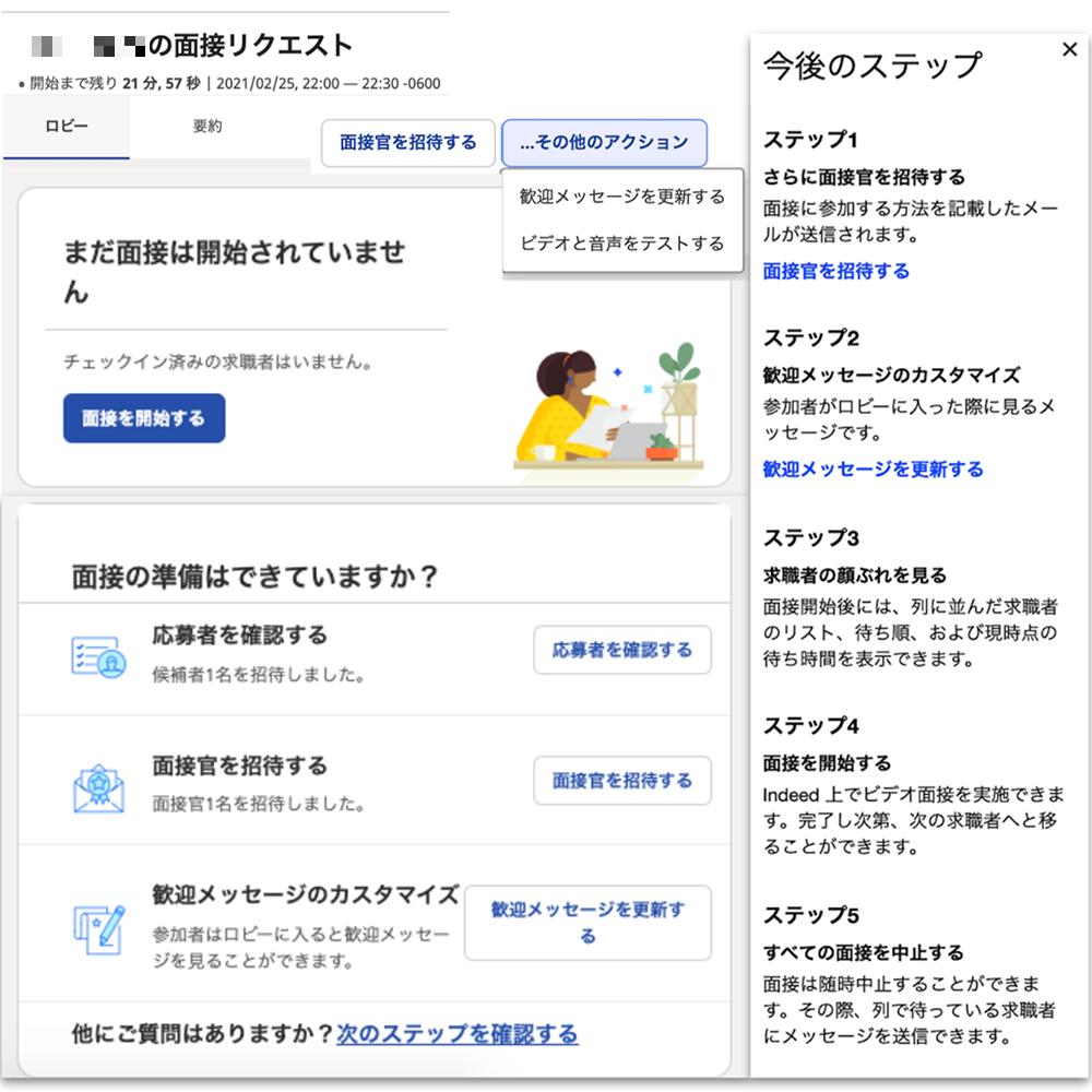 - [面接を開始する] ボタンは、面接の1時間前からアクセス可能です